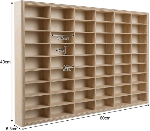Sprytny system wyjmowanych przegród z 3‑mm sklejki pozwala zmieniać układ według potrzeb – twórz mniejsze lub większe przegródki dokładnie pod swoje zbiory. Półka jest przygotowana do montażu na ścianie, ale można ją też postawić na komodzie czy stole. W opakowaniu znajdziesz zestaw montażowy i 2 wieszaki do bezpiecznego mocowania.