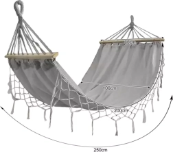 Hamak GARDLOV łączy naturalny wygląd z wysoką trwałością. Przyjemna w dotyku bawełna z domieszką poliestru jest miękka, dobrze oddycha i sprawdza się przy codziennym użytkowaniu. Drewniane rozpórki (80 cm) utrzymują powierzchnię rozłożoną, dzięki czemu wygodnie poleżysz lub przysiądziesz.