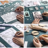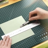 Dwustronne siatki pomiarowe, linie prowadzące kątowe i okręgowe przyspieszają wyrównanie materiału i zwiększają precyzję. Antypoślizgowy materiał trzyma się pewnie na miejscu, dzięki czemu możesz bezpiecznie pracować z gilotyną, skalpelem i nożem krążkowym.