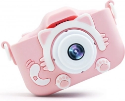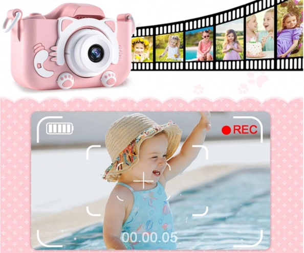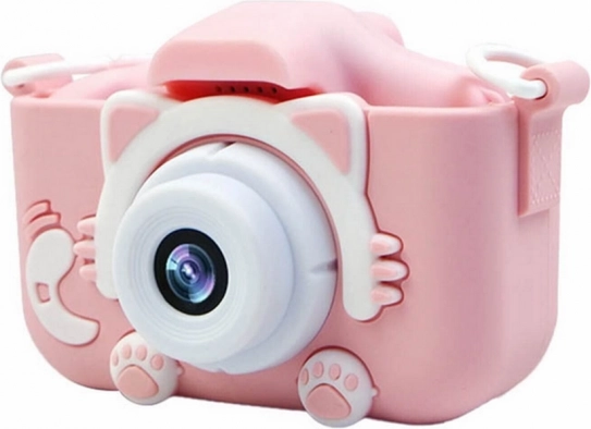 Aparat ma różowy wygląd w kształcie kotka z uszami i łapkami, który natychmiast przyciąga uwagę dzieci.